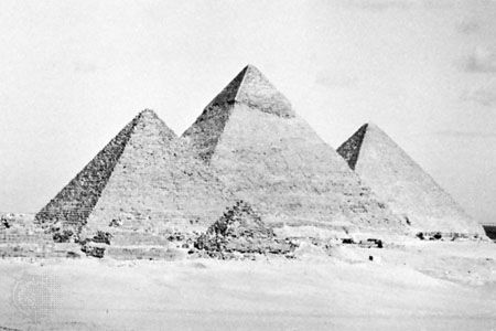 The Great Pyramid is one of the largest buildings ever constructed. It originally stood about 482 feet (147 meters) tall, but erosion and the removal of most of the polished limestone casing stones—which made the structure smooth and caused it to gleam in the sunlight—have lowered the pyramid’s height to 449 feet (137 meters). The base and three sides each measure 755 feet (230 meters) in length. The pyramid’s sides rise at an angle of 51.87° and are accurately oriented to the four cardinal points of the compass. The Great Pyramid’s core is made of yellowish limestone blocks, and the inner passages are of finer light-colored limestone. The interior burial chamber is built of huge blocks of granite. Approximately 2.3 million blocks of stone were cut, transported, and assembled to create the 5.75-million-ton structure, which is a masterpiece of technical skill and engineering ability. The internal walls, as well as those few outer-casing stones that still remain in place, show finer joints than any other masonry constructed in ancient Egypt.